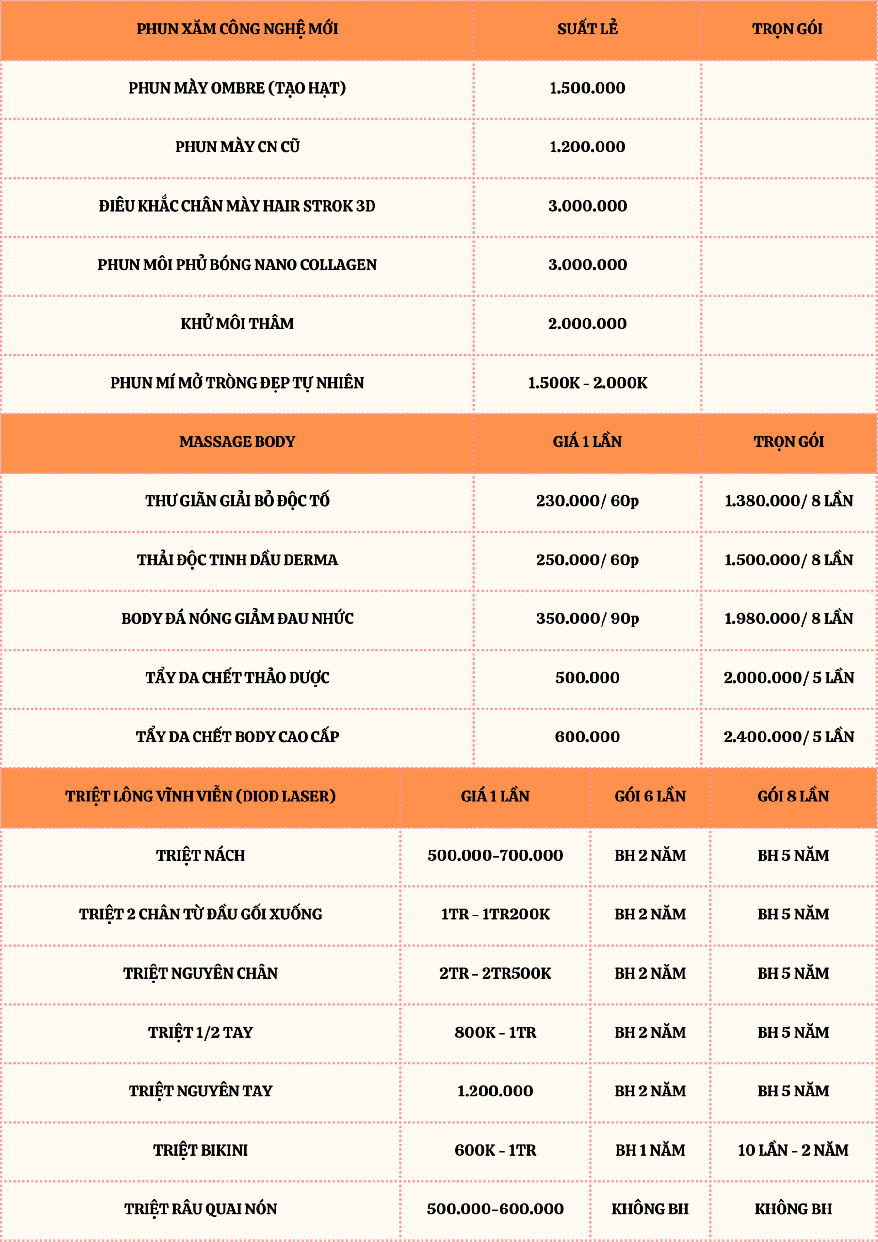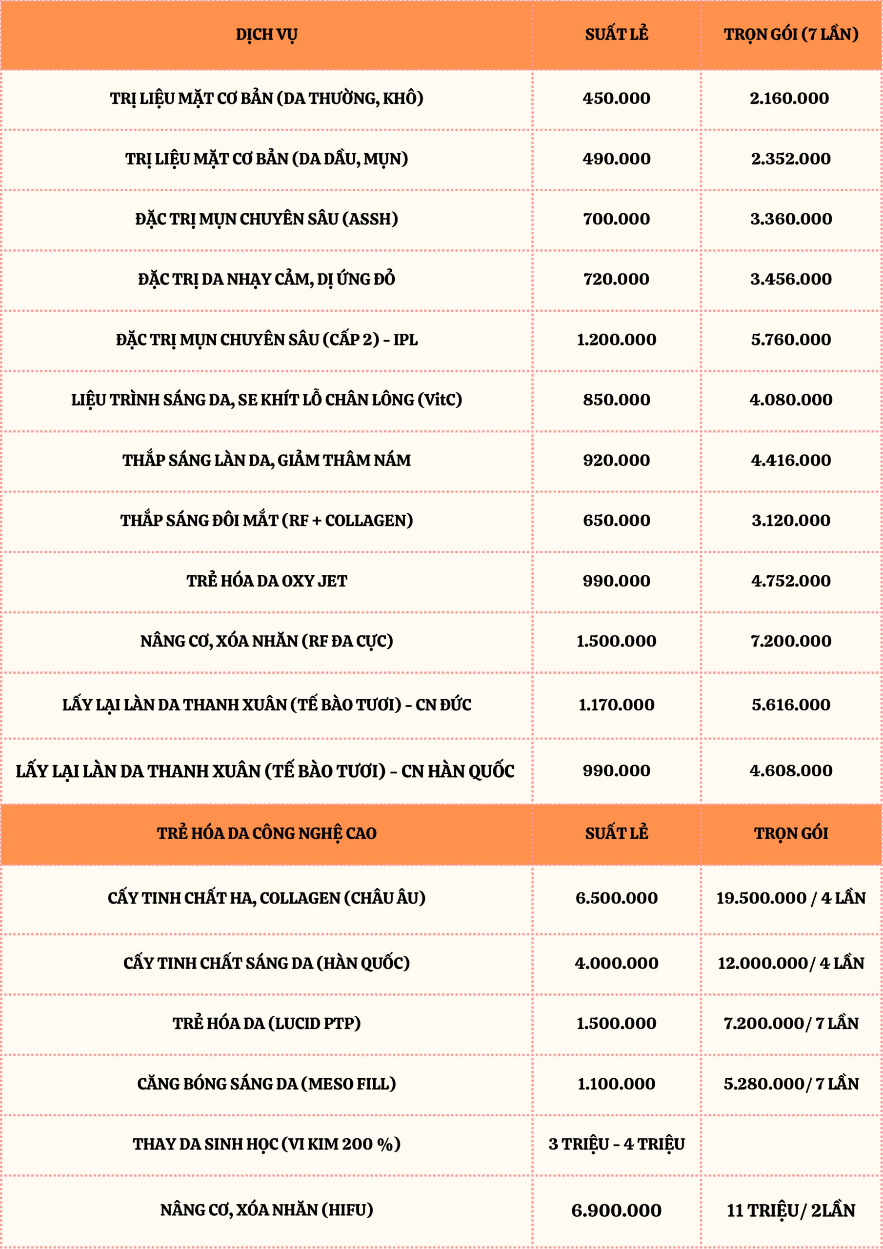 Mỗi dịch vụ đều được tư vấn cá nhân hóa phù hợp với tình trạng da và ngân sách của từng khách hàng. Hiện nay, bảng giá dịch vụ tại Mỹ Viện Phương dao động từ 450.000 – 3.000.000 VNĐ/lần, tùy theo công nghệ và cấp độ trị liệu. Đặc biệt, khách hàng đăng ký liệu trình trọn gói hoặc combo chăm sóc da định kỳ sẽ nhận được ưu đãi lên đến 30% cùng nhiều quà tặng hấp dẫn. Với phương châm “Đẹp an toàn – Hiệu quả bền lâu”, Mỹ Viện Phương cam kết mang lại làn da khỏe đẹp, mịn màng và rạng rỡ cho mọi khách hàng.